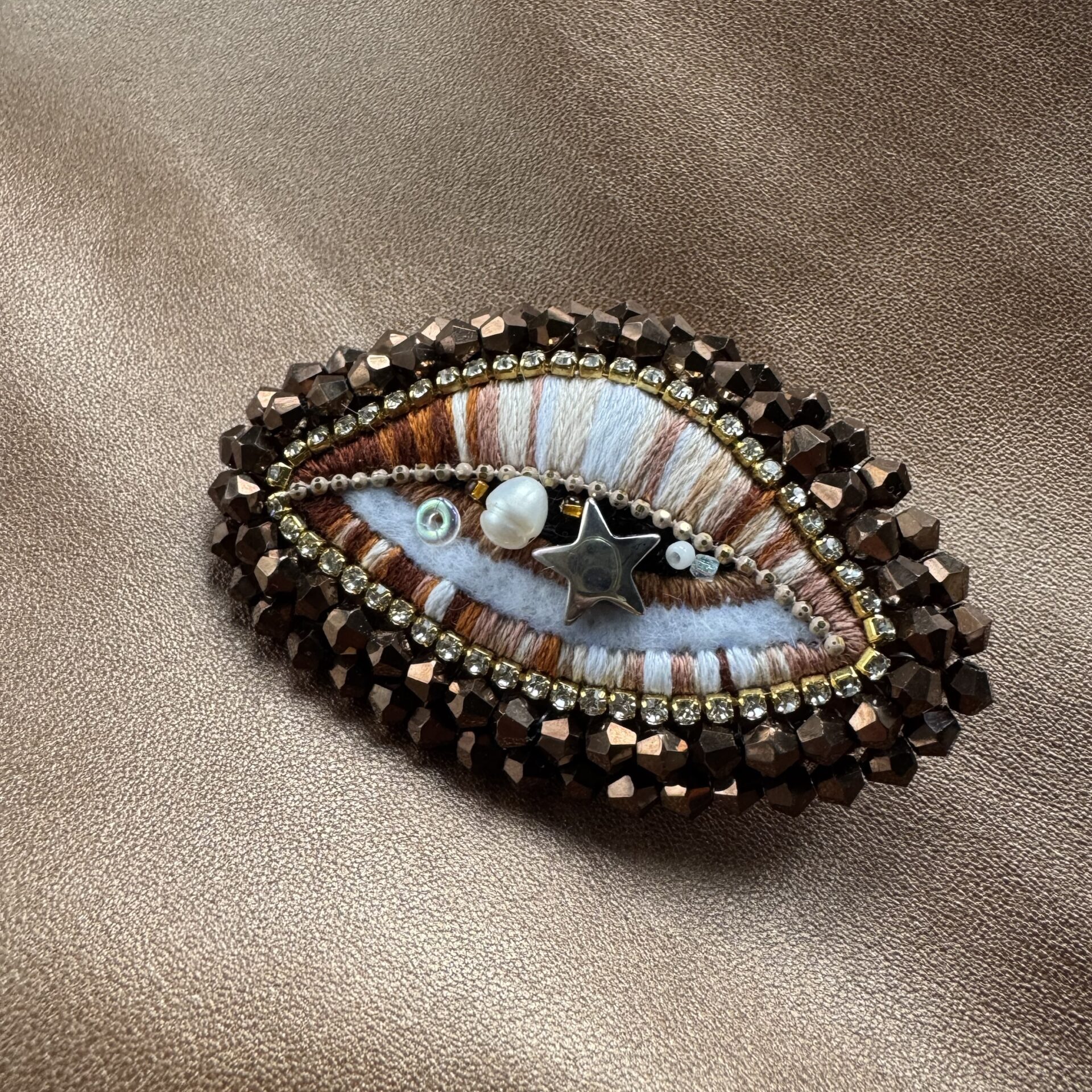 Duża broszka na standardowej bazie, zdobiona taśmami cyrkoniowymi i szklanymi kryształkami oraz perłą i hematytową gwiazdką w centrum.