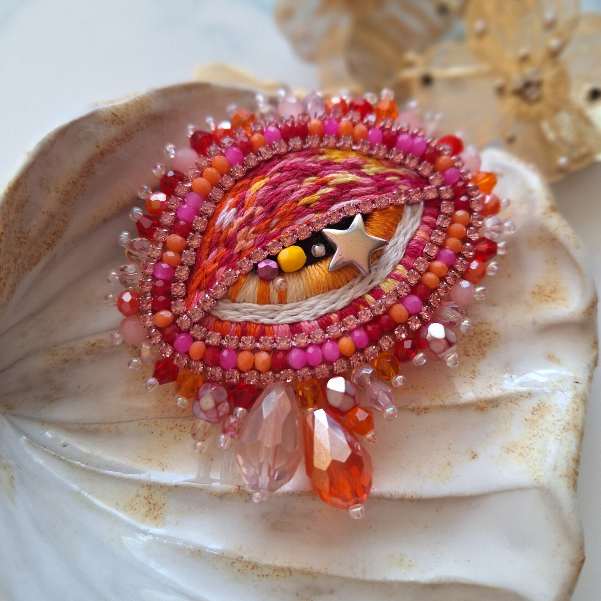 Duża broszka na agrafkowej bazie dedykowanej do swetrów i grubych materiałów, zdobiona kryształkami, koralikami TOHO i taśmami cyrkoniowymi. Hematytowa gwiazda w centrum.