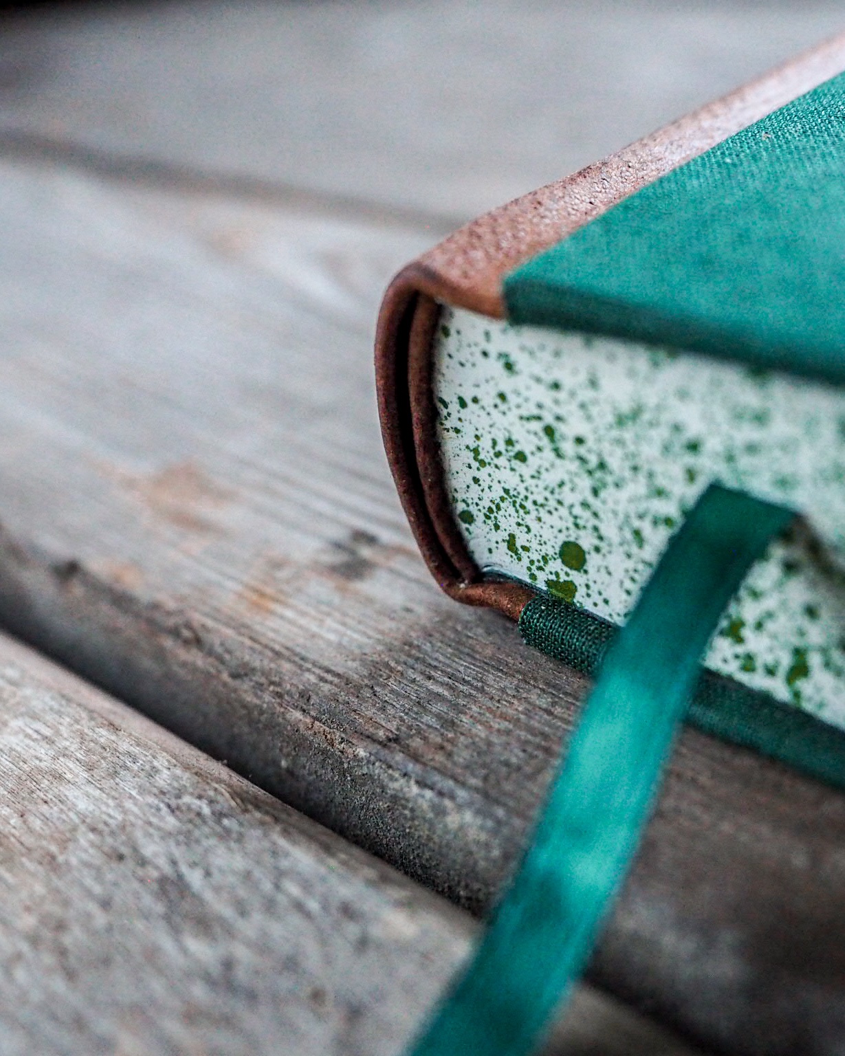 Oprawa wiskozowa, grzbiet z naturalnej skóry licowej, satynowa tasiemka w kolorze zielonym, wyklejka w kolorze zielonym, brzegi nakrapiane w kolorze zielonym.