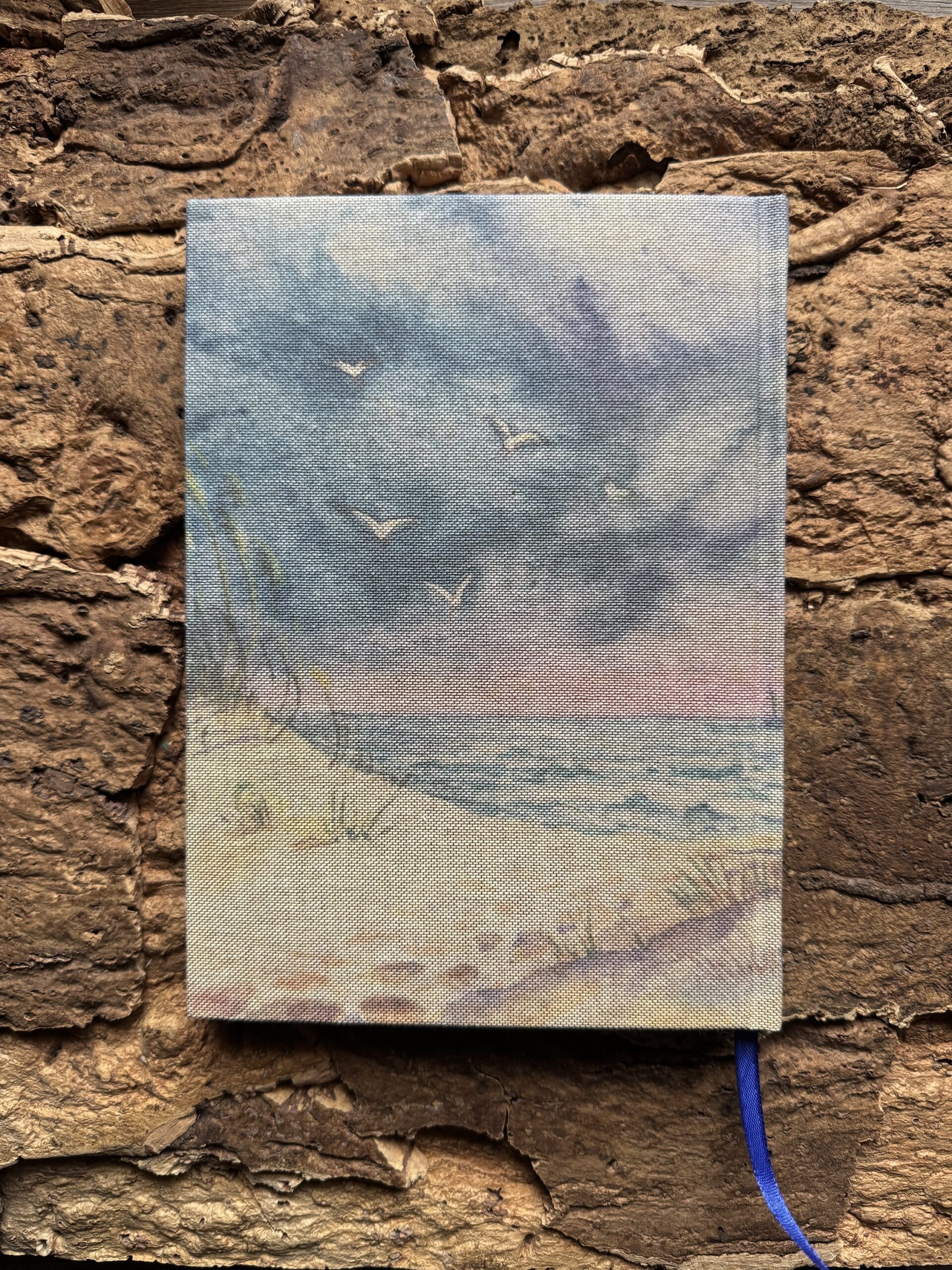 Notatnik ręcznie szyty i klejony, z kremowego papieru 100g, ubrany w lnianą oprawę z nadrukiem