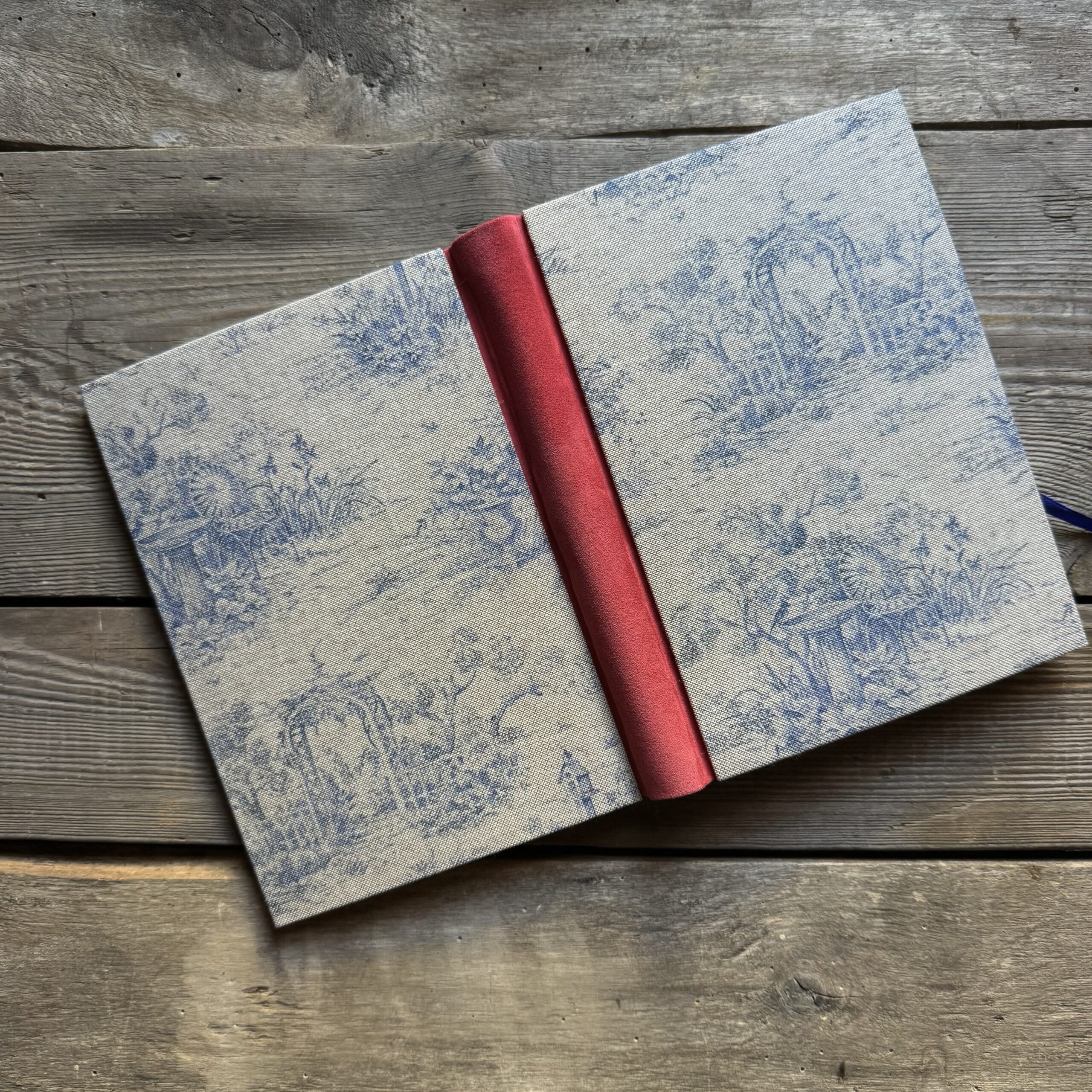 Notatnik ręcznie szyty i klejony, z kremowego papieru 100g, ubrany w lnianą oprawę z nadrukiem, grzbiet z naturalnej skóry zamszowej