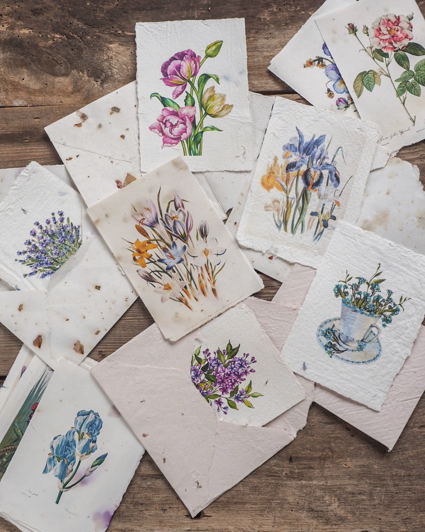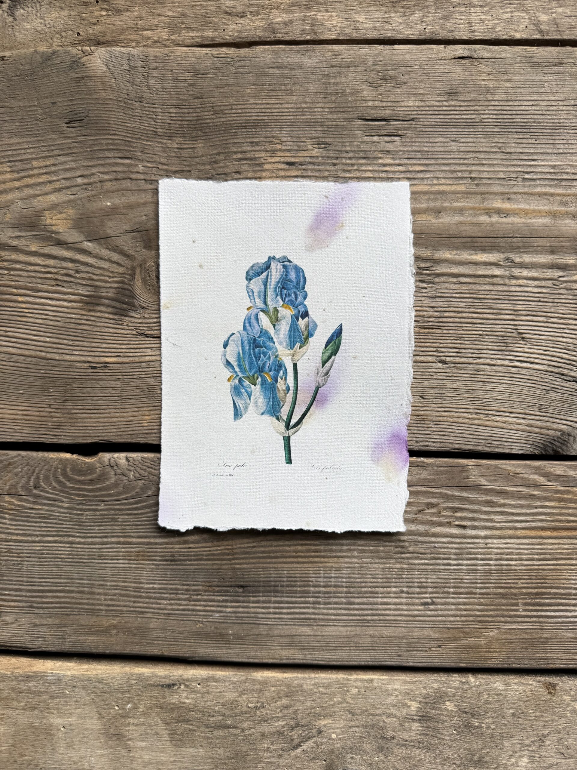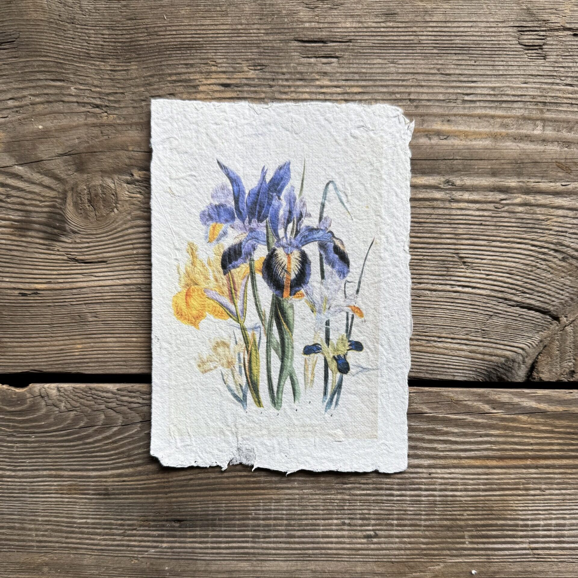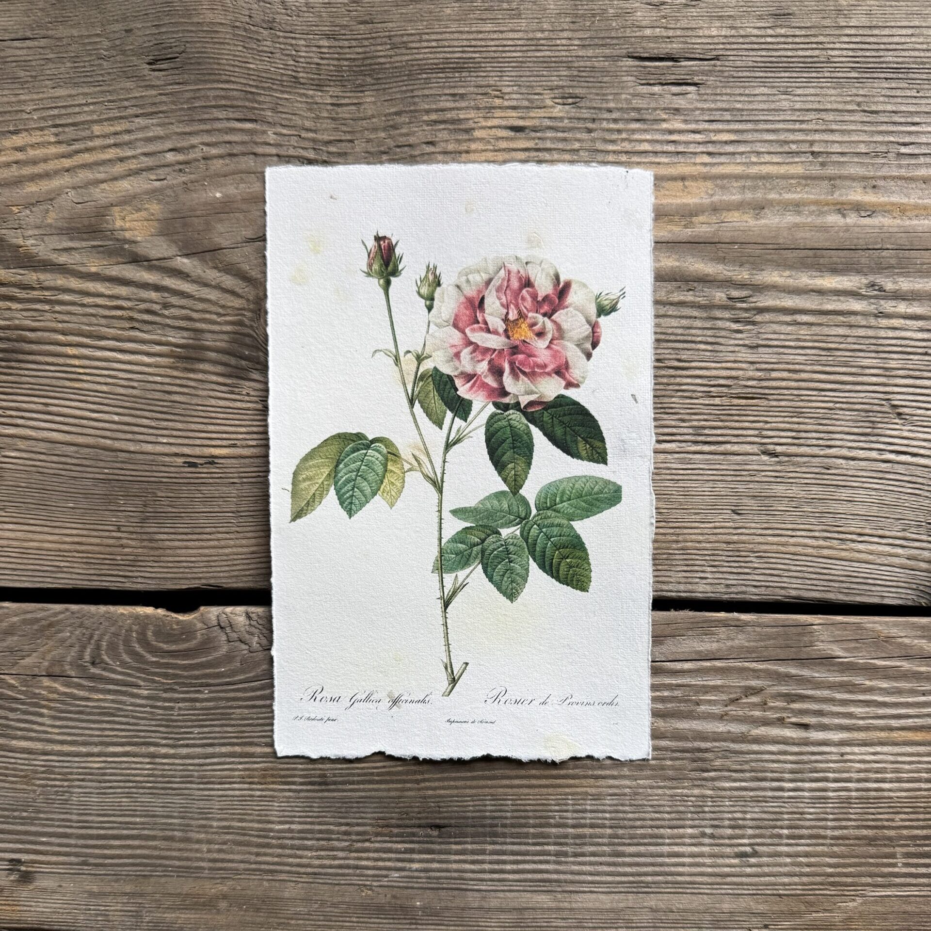 Print wykonany na arkuszu z pulpy wysokiej jakości kremowego papieru, wzbogacony w płatki kwiatów (róża lub chabry), nadające mu oryginalne, romantyczne tony. Z uwagi na ręczny proces czerpania, każdy arkusz jest inny i niepowtarzalny, z nieregularnymi brzegami i chropowatą powierzchnią. Bazą jest format A6, jednak wymiary mogą różnić się o kilka milimetrów w każdą stronę (ok. 14,8-15,5 x 9,8-10,7 cm)