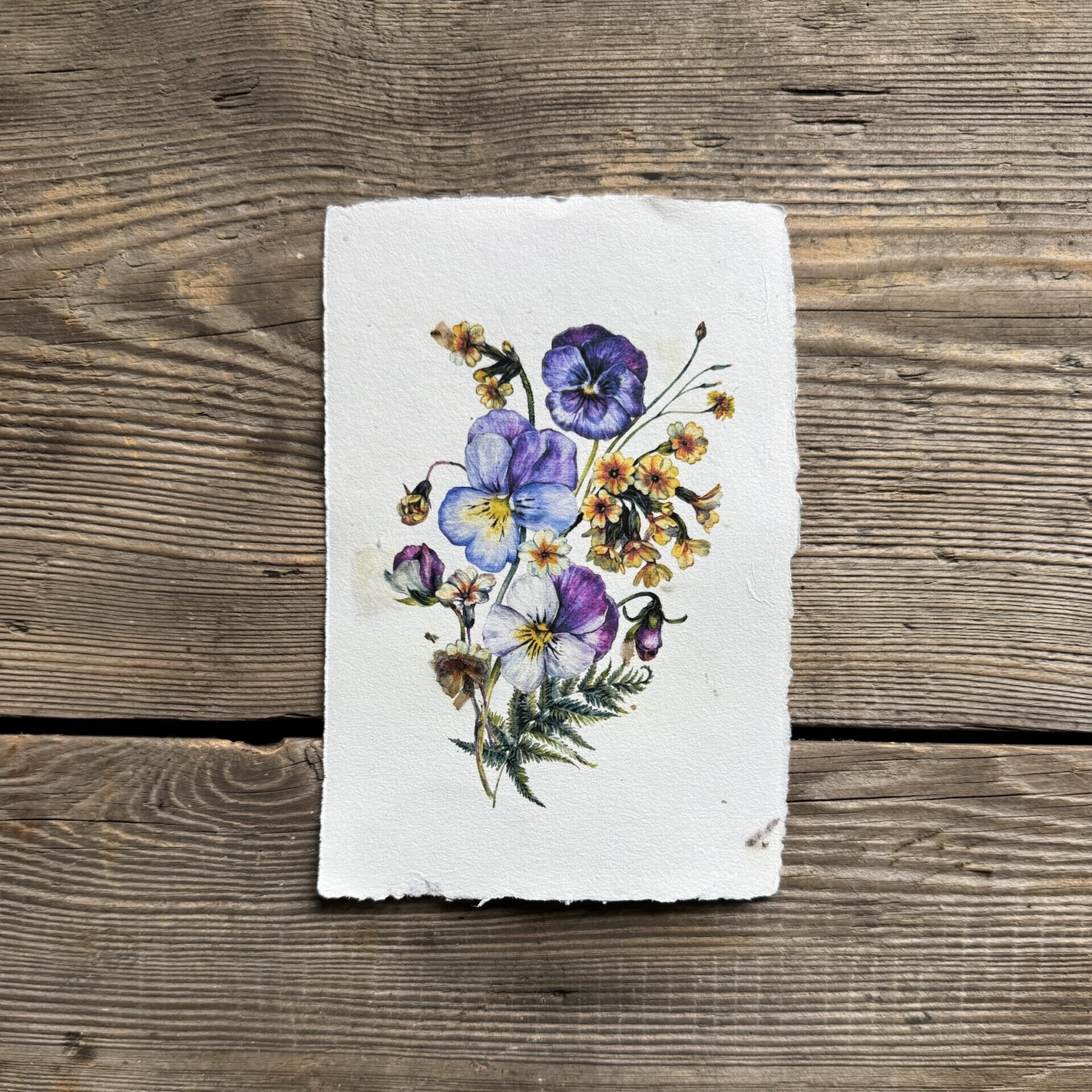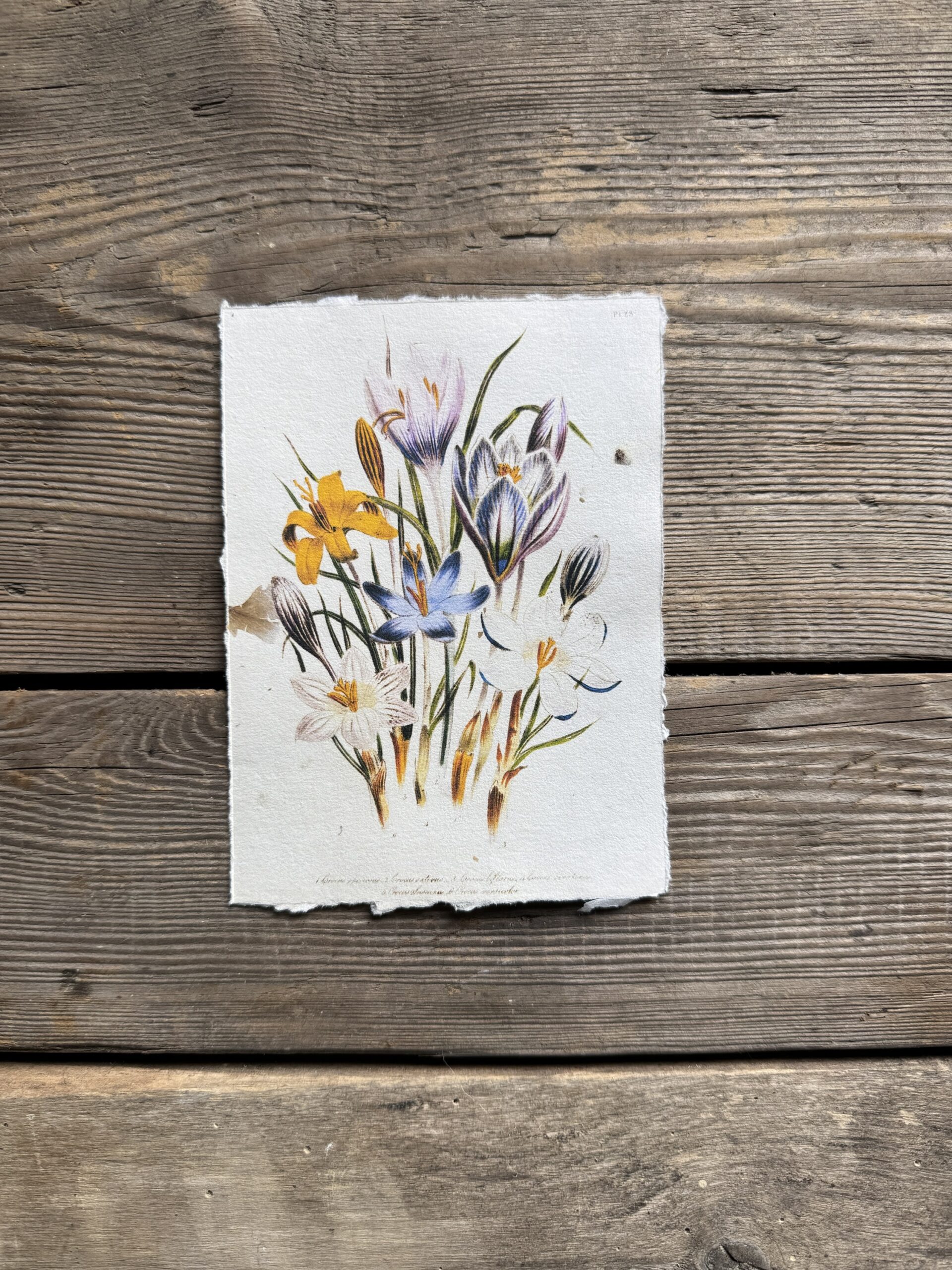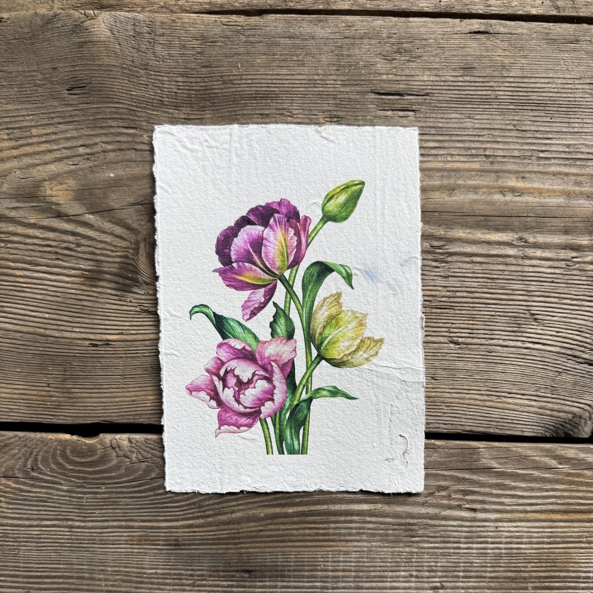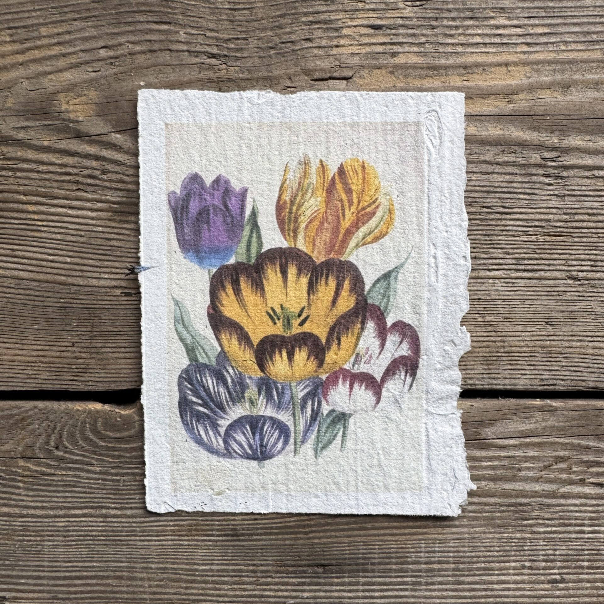 Print wykonany na arkuszu z pulpy wysokiej jakości kremowego papieru, wzbogacony w płatki kwiatów (róża lub chabry), nadające mu oryginalne, romantyczne tony. Z uwagi na ręczny proces czerpania, każdy arkusz jest inny i niepowtarzalny, z nieregularnymi brzegami i chropowatą powierzchnią. Bazą jest format A6, jednak wymiary mogą różnić się o kilka milimetrów w każdą stronę (ok. 14,8-15,5 x 9,8-10,7 cm)