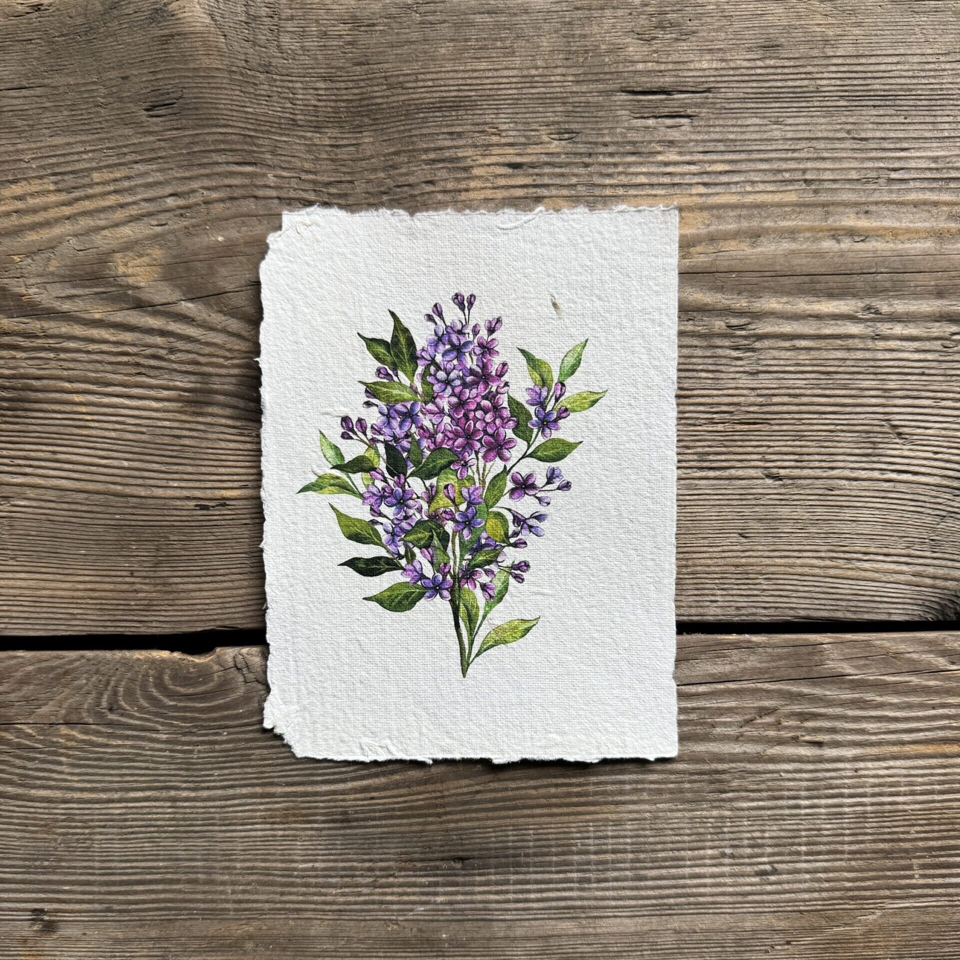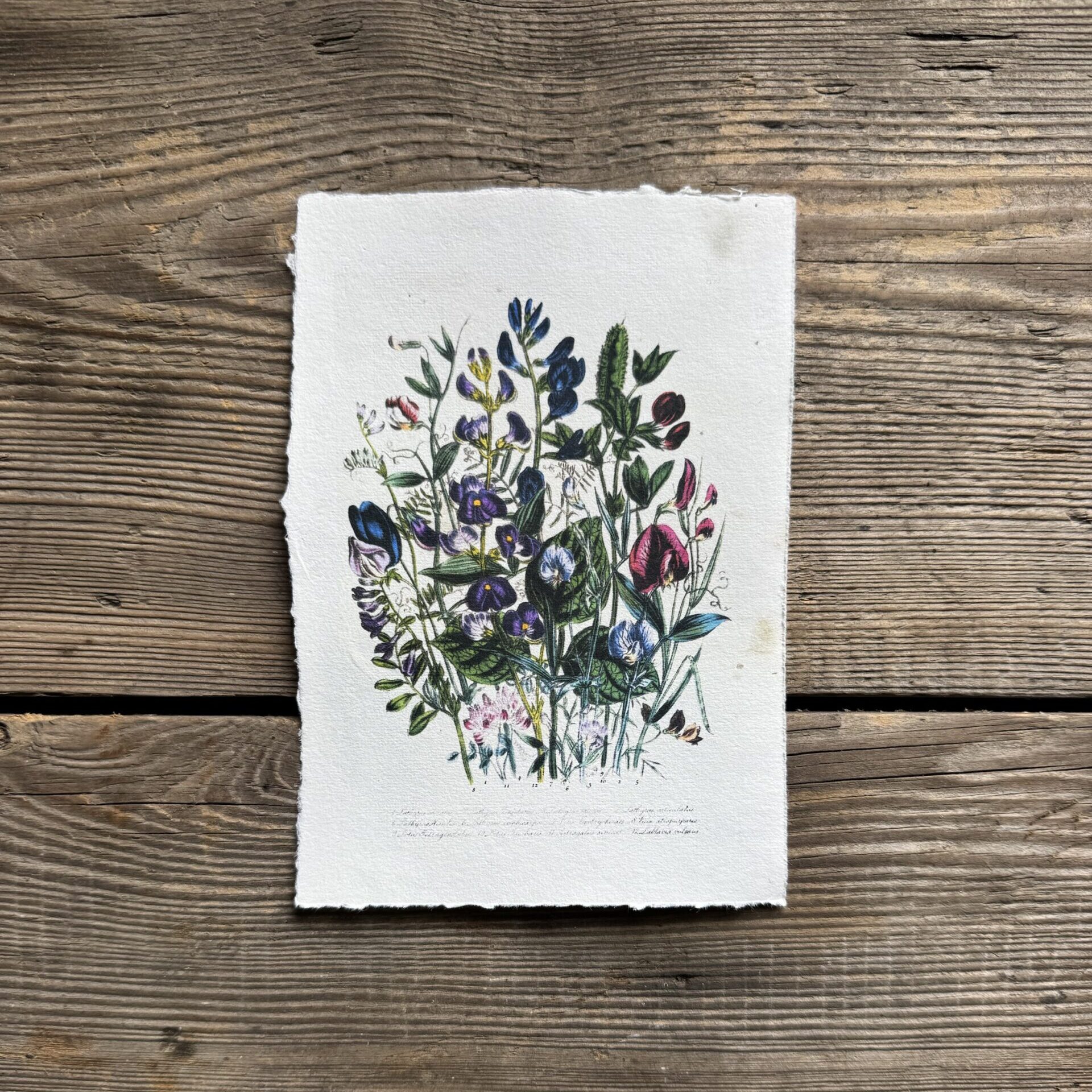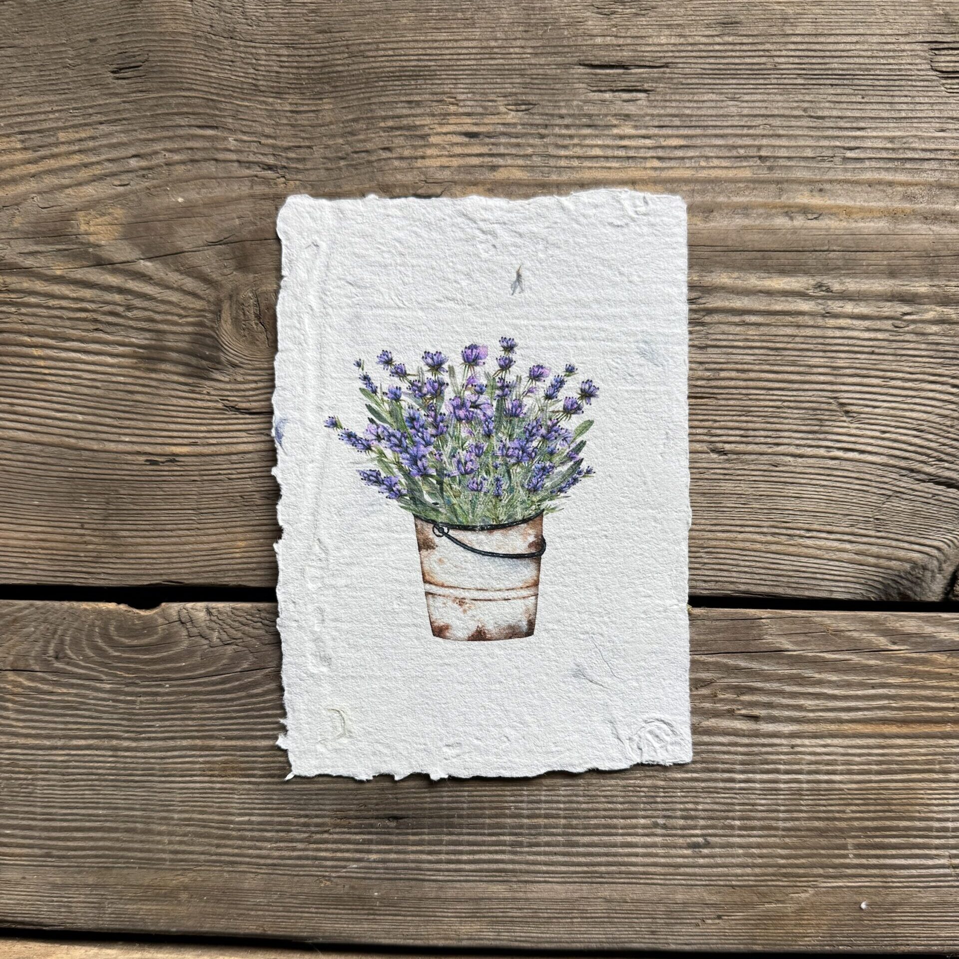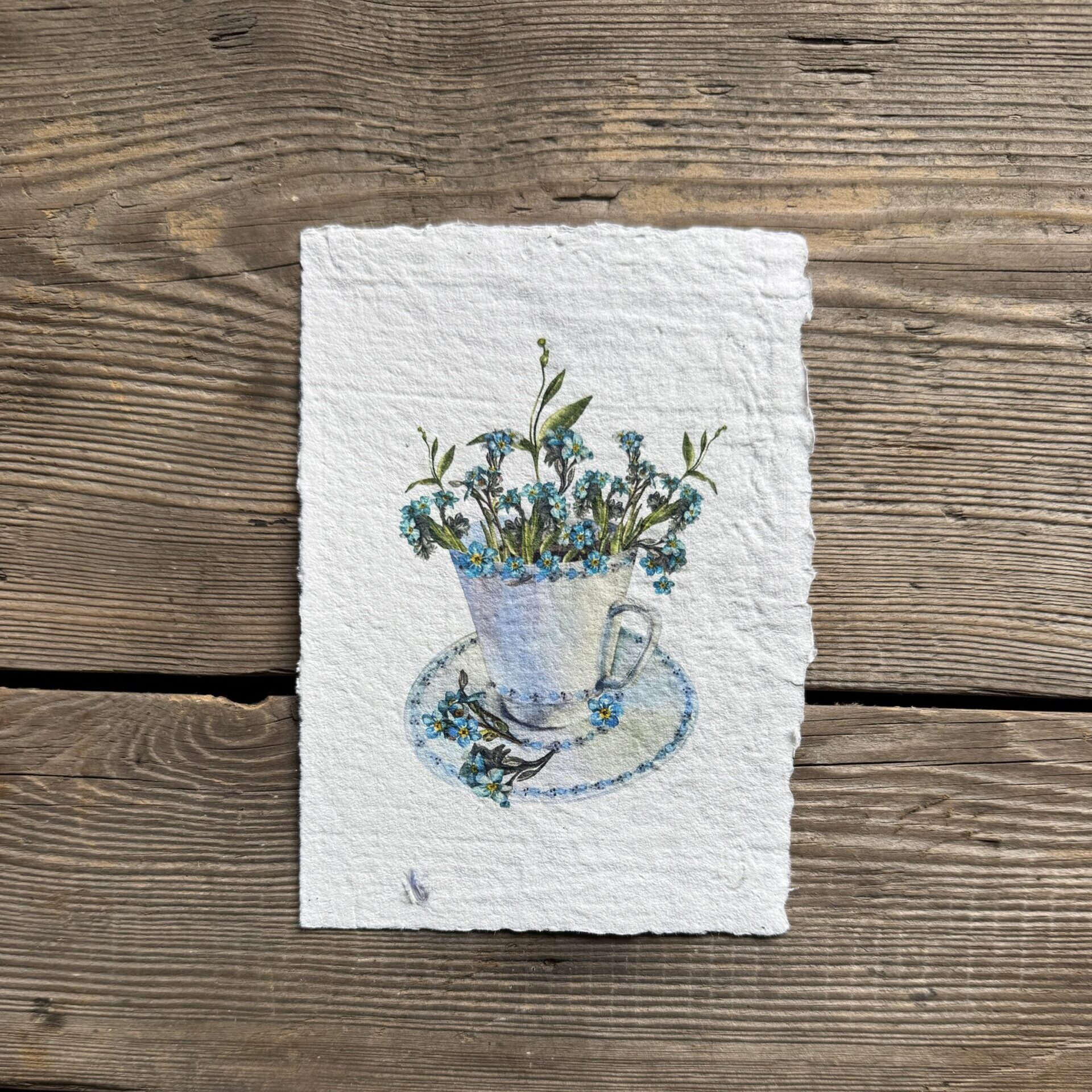 Print wykonany na arkuszu z pulpy wysokiej jakości kremowego papieru, wzbogacony w płatki kwiatów (róża lub chabry), nadające mu oryginalne, romantyczne tony. Z uwagi na ręczny proces czerpania, każdy arkusz jest inny i niepowtarzalny, z nieregularnymi brzegami i chropowatą powierzchnią. Bazą jest format A6, jednak wymiary mogą różnić się o kilka milimetrów w każdą stronę (ok. 14,8-15,5 x 9,8-10,7 cm)