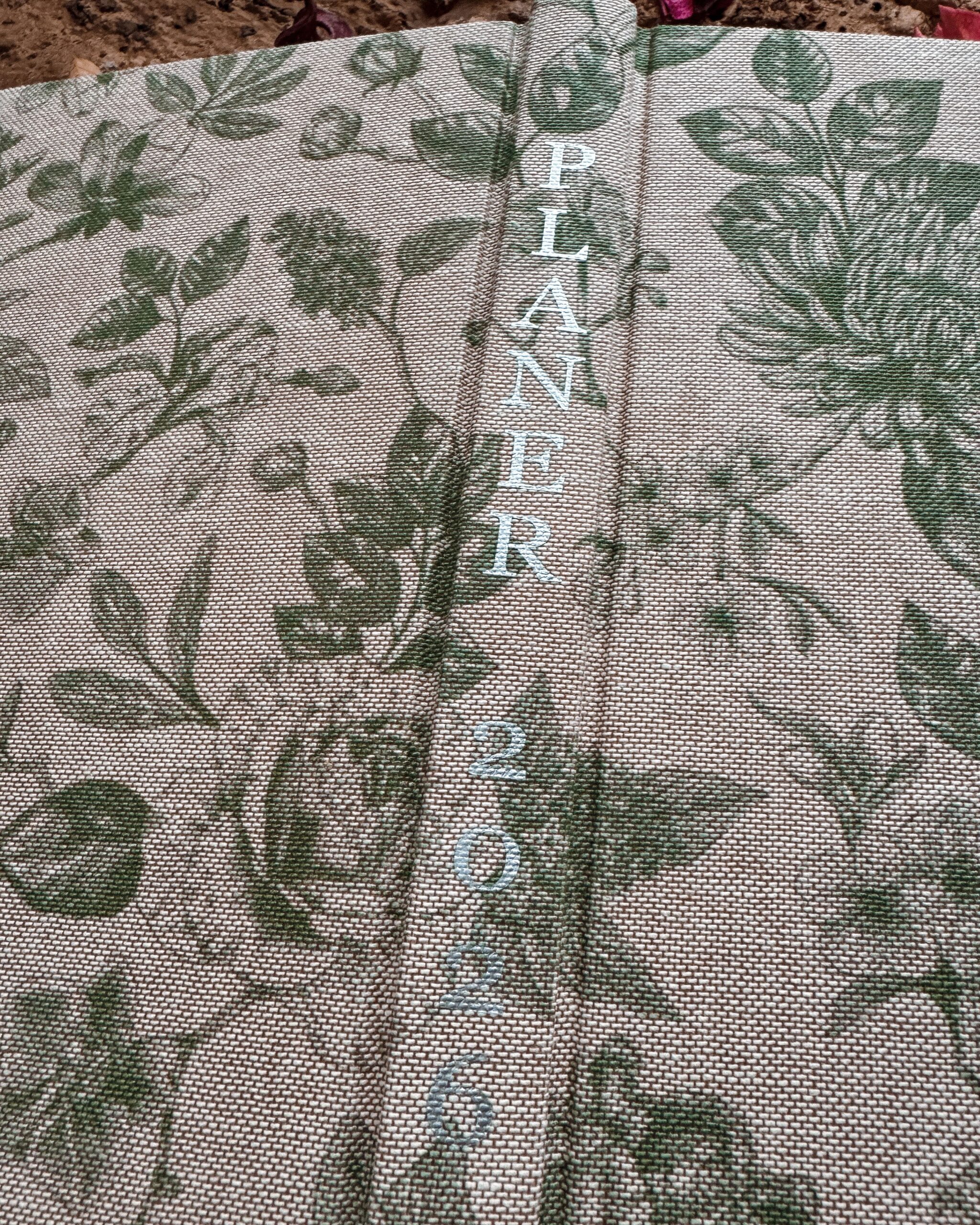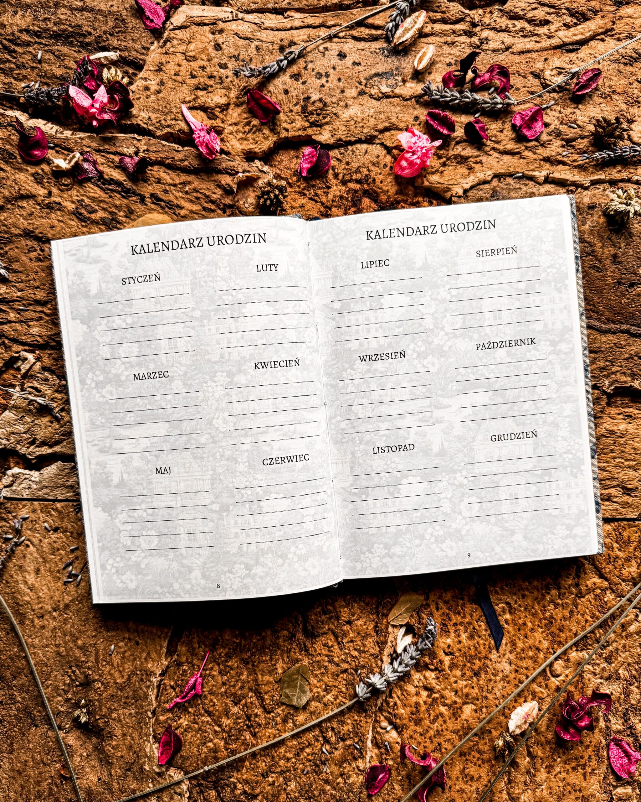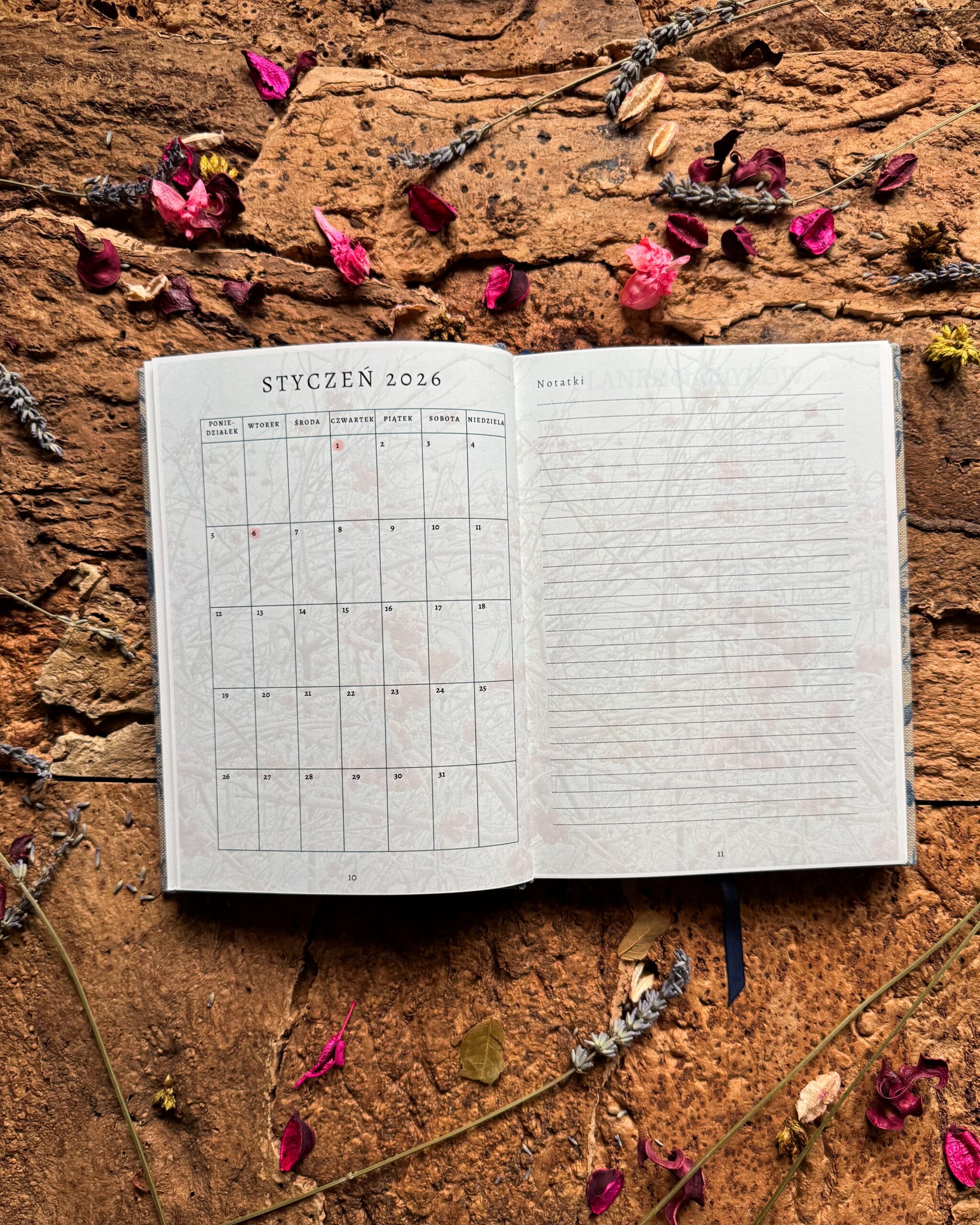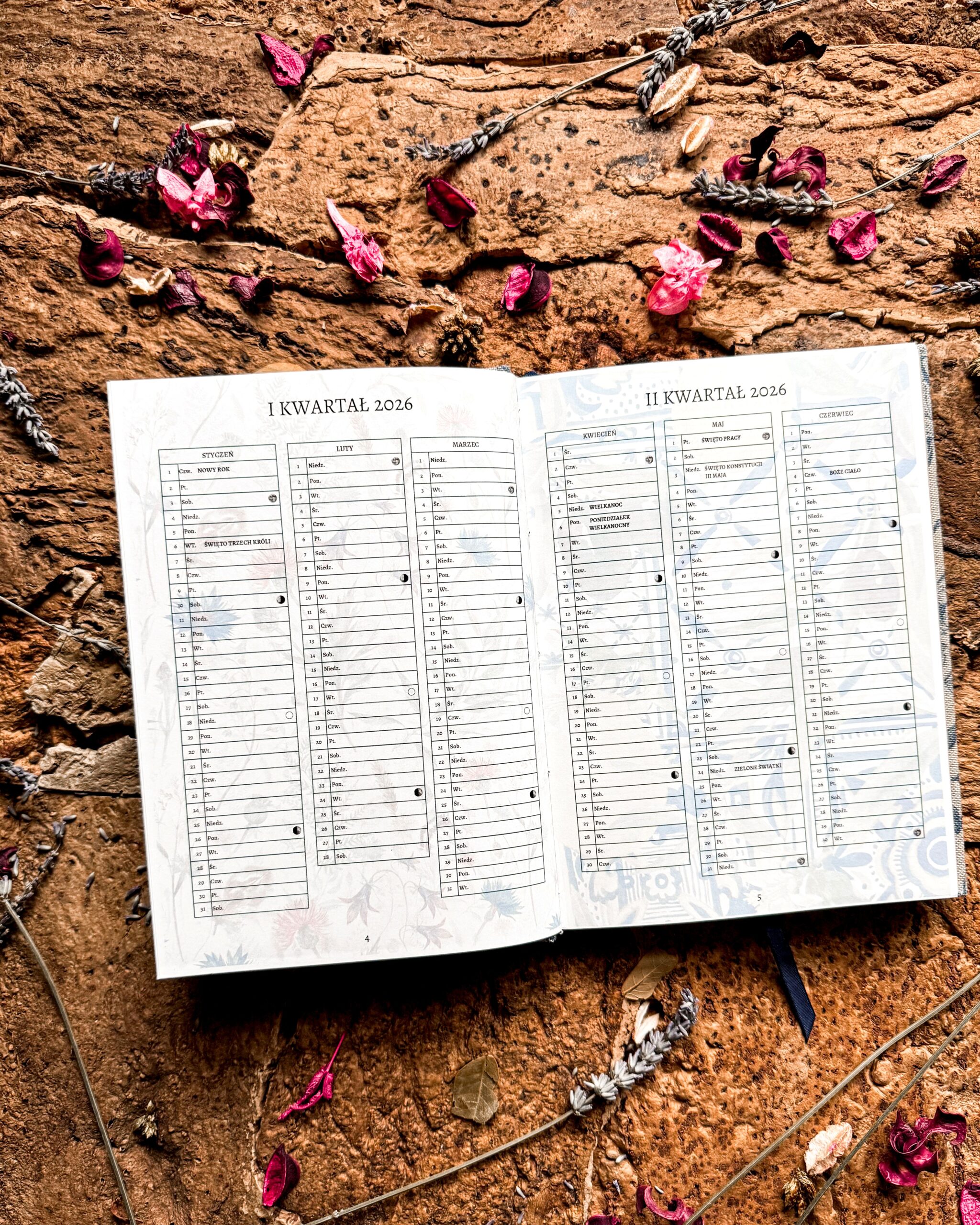Planery na 2026r. z rozkładem tygodniowym. Na początku znajduje się rozkład kwartalny, a każdy miesiąc rozpoczyna się tabelą miesięczną oraz miejscem na stworzenie listy to-do i planera nawyków. Na jego końcu dostępnych jest 12 stron z miejscem na notatki. Kalendarze są szyte ręcznie z kremowego papieru 100g z twardą, lnianą okładką, dostępne w formacie A5 (ok. 21 x 14,5 cm).